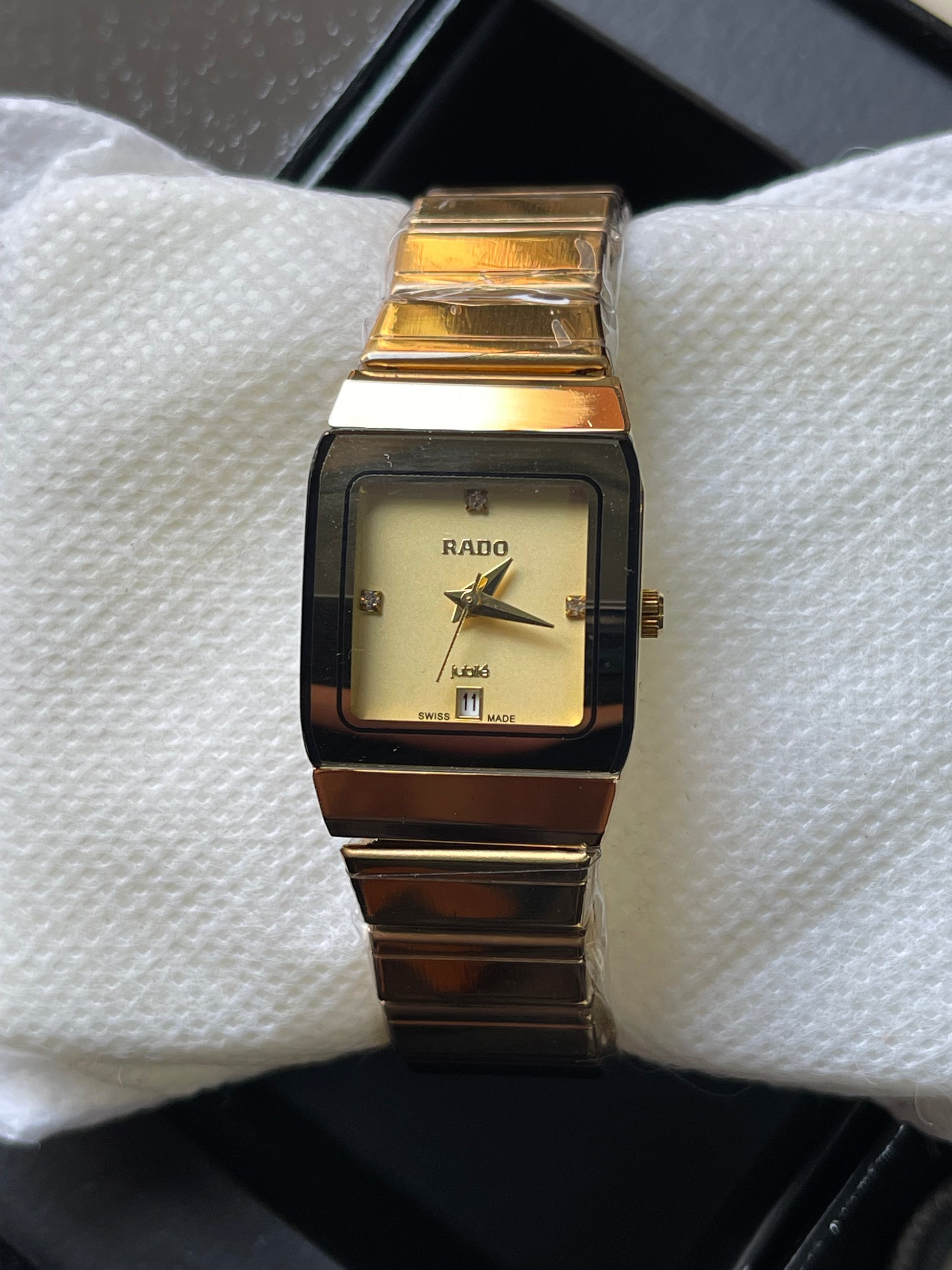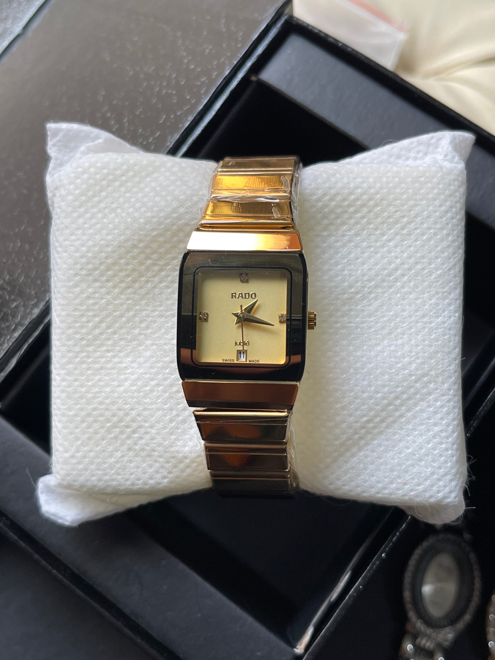 - Elegant matte black dial with gold watch hands
