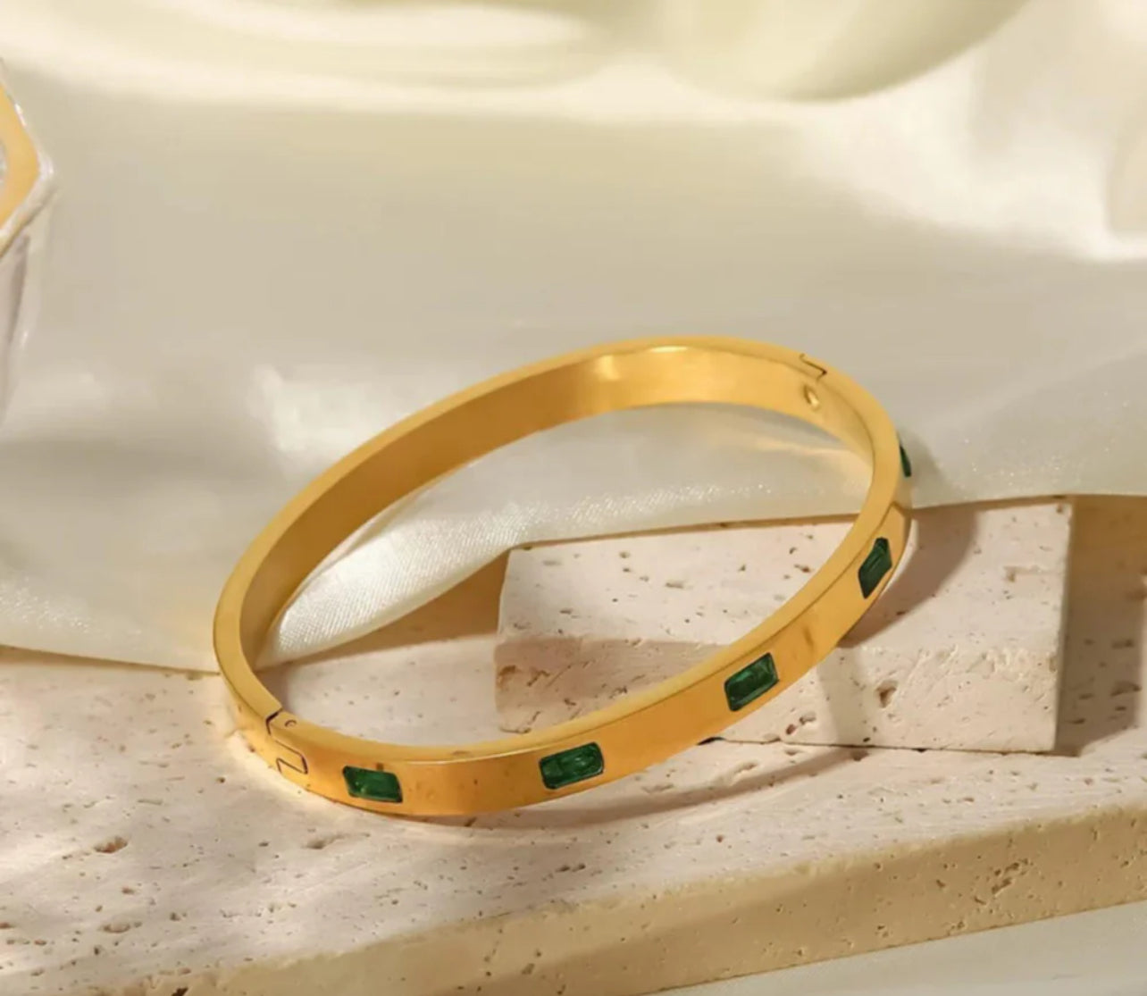 Crafted with a lustrous gold finish and detailed with deep green baguette-cut stones, this piece captures the quiet power of subtle luxury. The slim, minimalist silhouette pairs effortlessly with any look — from boardroom chic to evening glam.